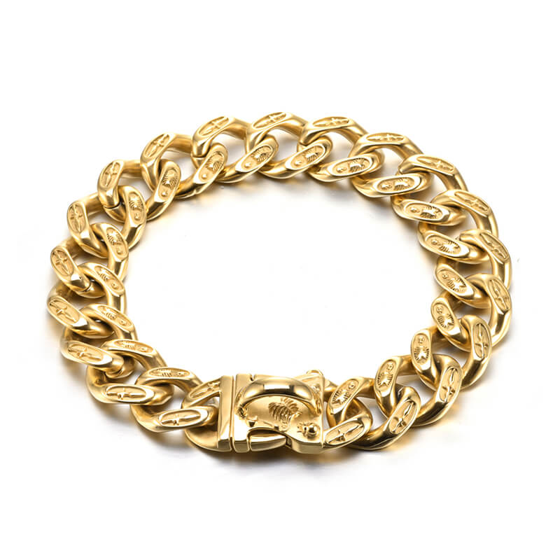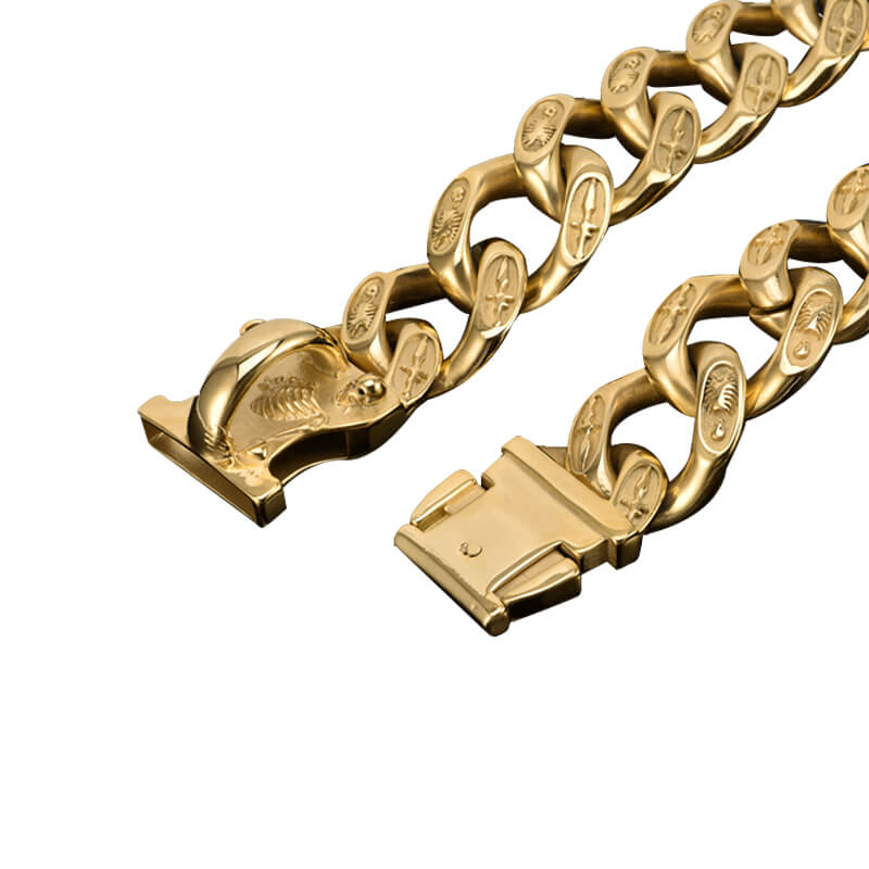 Adorned with sword and skeleton engravings on the links, the chain perfectly resonates with the self-confidence that your dog possesses. A special protective PVD 18k coating extends an all-weather resistant touch to it. No amount of moisture or wear can mess with the bright look of the Gold Knight